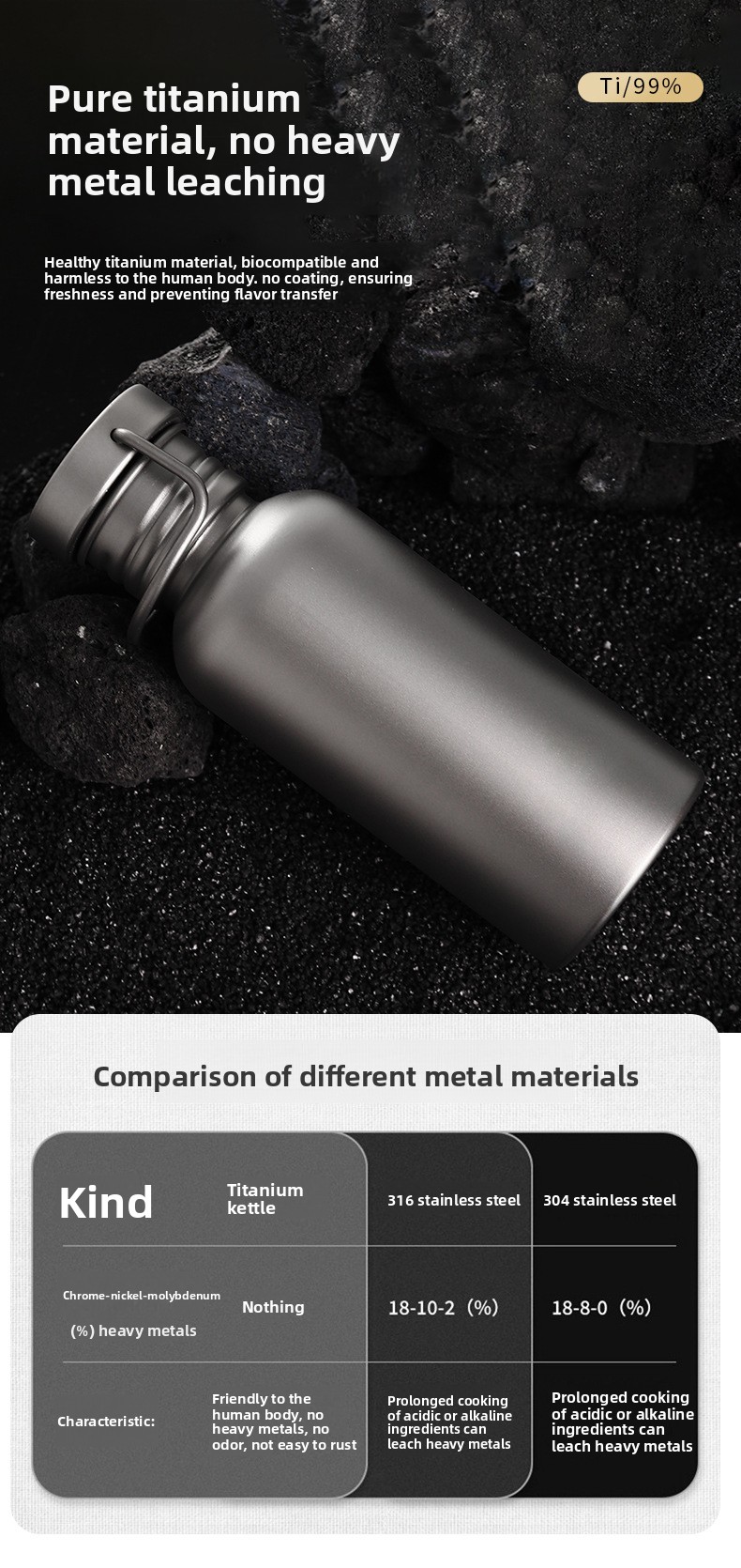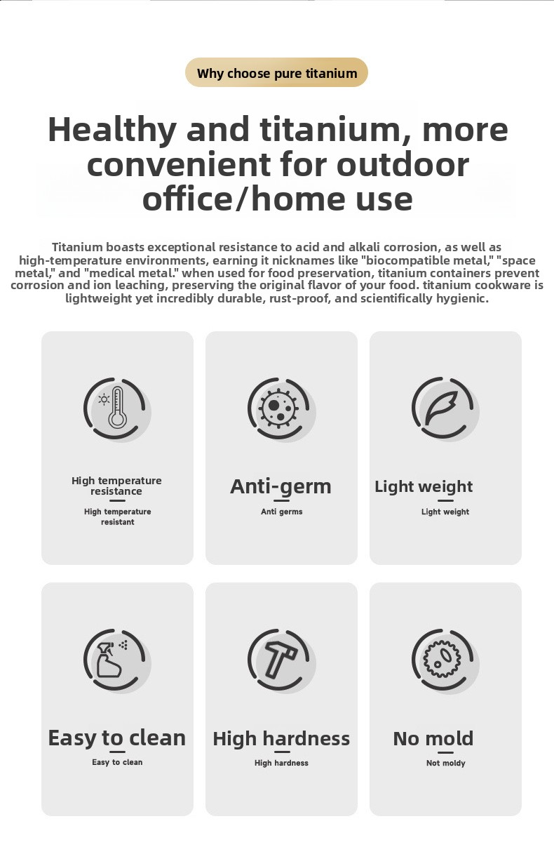 Pure Titanium: Made from 99.7% pure titanium (TA1), lightweight and durable for outdoor use.